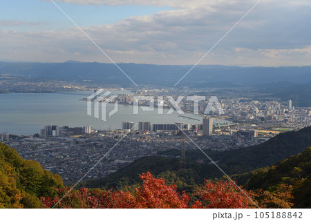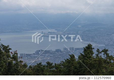 日本 京都府京都市の比叡山にあるガーデンミュージアム比叡駐車場からの大津の街並みと琵琶湖