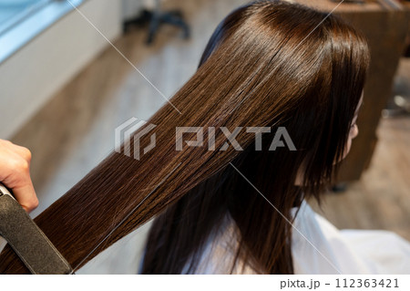 Gorgeous woman with long hair using a straight hair iron and doing a hairstyle