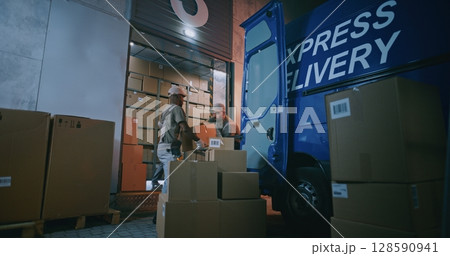 Multiethnic Workers Loading Cardboard Boxes with Online Orders in Truck, Working at Night