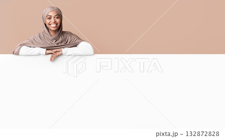 Free space for your advertisement. Happy afro muslim woman in hijab leaning on white billboard, yellow background