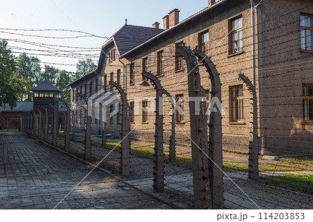 【ポーランド】アウシュビッツ・ビルケナウ強制収容所の有刺鉄線のフェンスに囲まれたレンガ造りの建物