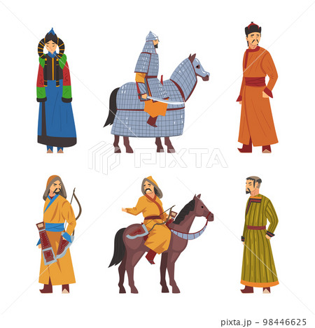 Mongol Nomad Characters in Traditional Clothing Vector Set