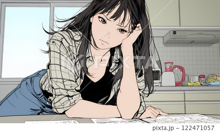 家計簿が赤字:心配事を抱えて憂鬱な気分の若い女性