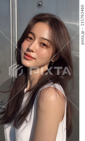 Young Korean woman with long hair posing elegantly in a bright outdoor setting on a sunny day