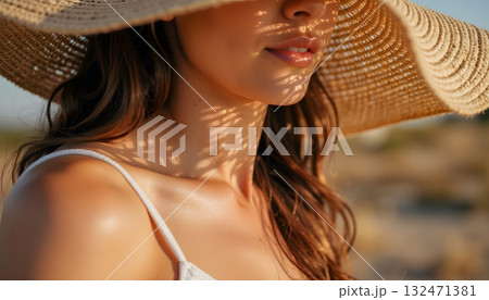 Beautiful Woman in Straw Hat with Sunlight Shadows on Face at Beach Setting