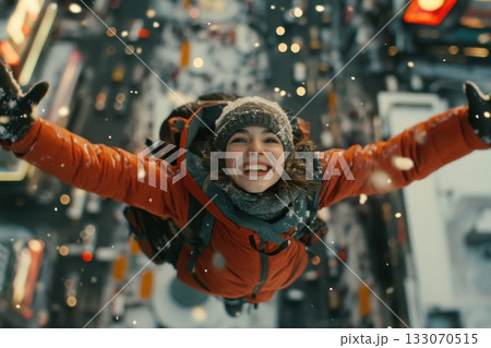 Joyful woman enjoying snow in Times Square, New York, during winter, celebrating the season with a carefree attitude amidst a bustling urban landscape