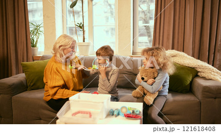 Grandmother adjusts stethoscope for boy, promoting hands-on learning of medical tools while girl explores health-related knowledge with toy instruments.