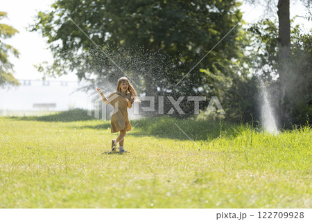 Banner smiling 9 year old girl in oversize sweater running in yellow rapeseed field