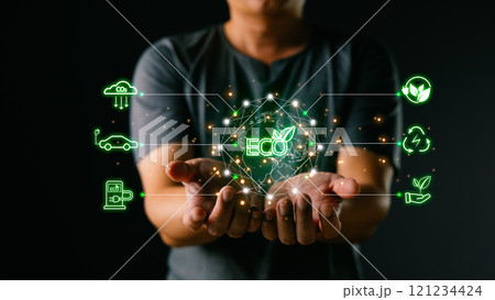 Climate change,hand hold hologram to save energy,and reduce global warming,ecology friendly investment,ESG environment social governance,Green Business Innovation and Sustainable Development concept.