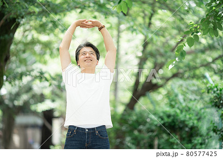 新緑 シニア女性 笑顔 ストレッチ 伸び