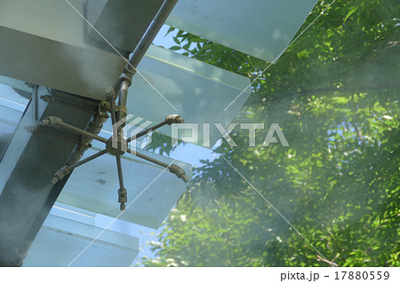 ミストを振りまく扇風機 熱中症対策 夏風景