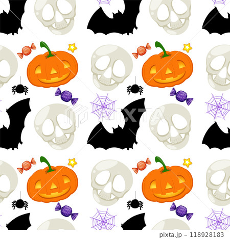 Simple sweets hand drawn Halloween seamless pattern on white background. Vector wallpaper illustration repeat design for fabric print, sticker, cover, wrapping.