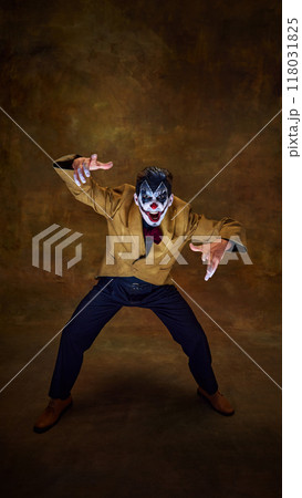 Man in clown make-up, crouching with outstretched arms, his face contorted in menacing expression, posing against vintage background.