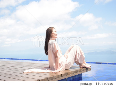 びわこテラスのウッドデッキに座るロングヘアののシニア女性
