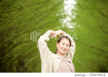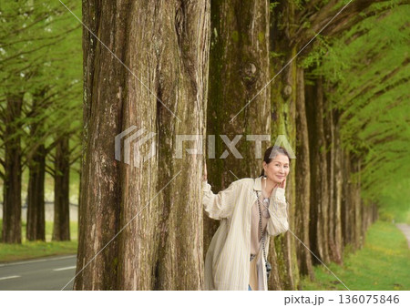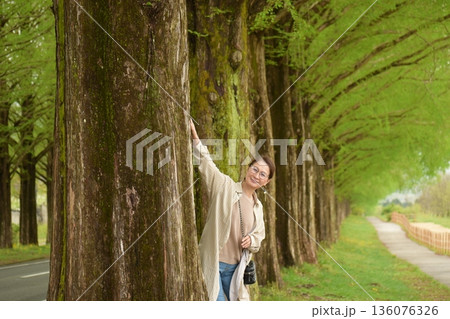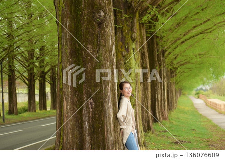 新緑のメタセコイヤ並木道を笑顔で散歩する女性