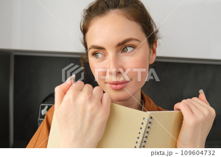 Close up portrait of young romantic woman, smiling, looking aside, holding notebook, reading notes, writing in diary, checking her planner