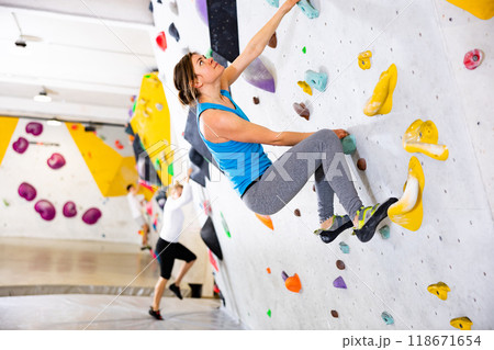 Young female alpinist practicing indoor rock-climbing on a artificial boulder without safety belts