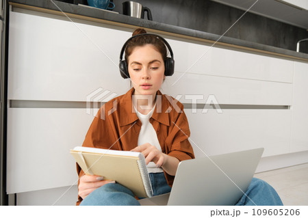 Close up portrait of beautiful, carefree young woman in black wireless headphones, smiling with eyes closed, sits on kitchen floor and listens to music or empowering podcast