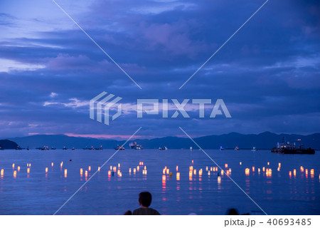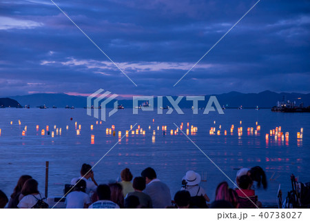 福井 敦賀 気比海岸 とうろう流しと大花火大会 とうろう流しの写真を撮る人