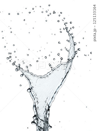 白い背景にカーブした抽象的な波と水しぶきの3dイラスト