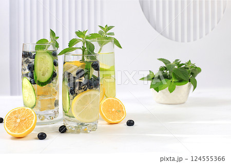 Detox diet and summer party concept. Cold homemade lemonade or cocktail with mint, lemon, cucumber and lime on a sunny table, Refreshing summer drink recipe, restaurant menu, selective approach