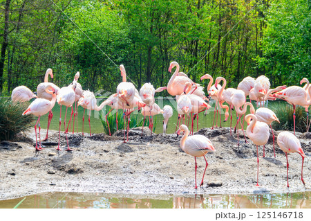 Flock of lesser flamingos (Phoenicoparrus minor) in a lake