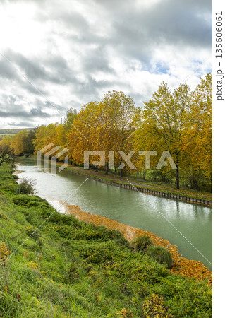 Canal de Bourgogne with golden autumn foliage in Buffon