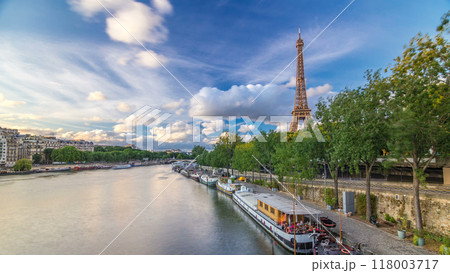 Eiffel Tower with boats at the evening timelapse hyperlapse Paris, France