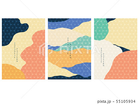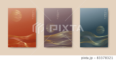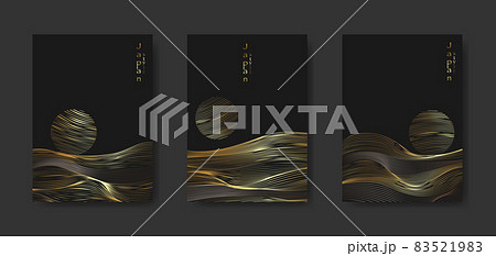 Japanese landscape background set cards gold line wave pattern vector illustration. Colorful luxury Abstract template geometric wavy texture. Mountain layout design in oriental style vertical brochure