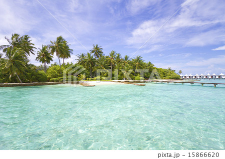インド洋の真珠モルディブ、美しいエメラルドグリーンの海と白砂のビーチの沖に建つ憧れの水上コテージ
