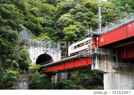 兵庫県 西宮市 武田尾温泉 特急「こうのとり」と名塩トンネル智久武田尾橋と武庫川(初秋)