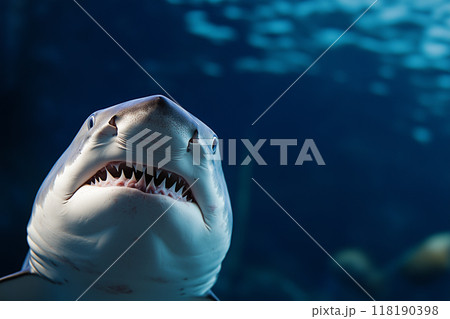 Ocean shark bottom view from below. Open toothy dangerous mouth with many teeth. Underwater blue sea waves clear water shark swims