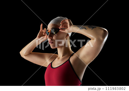 Confident young athletic woman in swimsuit wearing swim goggles against black studio background. Aqua sport.