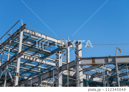 親綱と水平ネットを設置した建設現場 鉄骨建方工事