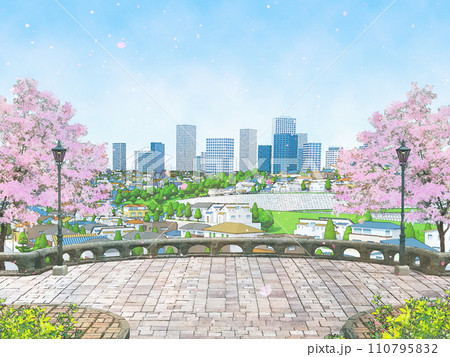 街並みと桜 水彩画風 手描き風