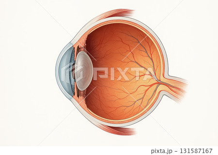 Medical illustration of human eye cross section showing retina, optic nerve, lens, cornea, and blood vessels, highlighting anatomical structure and function in clinical context