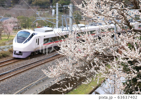 JR常磐線「水戸偕楽園の梅の花と特急電車」