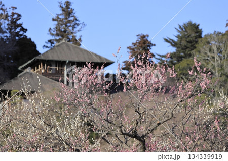 日本三名園の一つ、茨城県水戸市の偕楽園(かいらくえん)の満開の梅と好文亭(こうぶんてい)