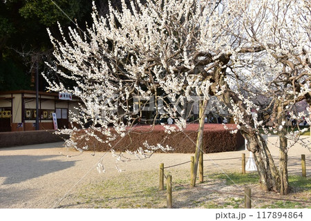 水戸市 偕楽園梅林周遊路の満開梅の花と観光客