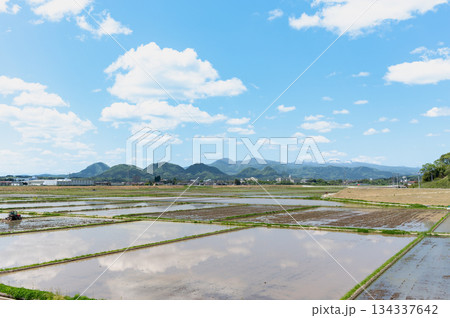 田植えが済んだ水田と富士山【山梨県忍野村】
