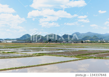 田植えが済んだ水田と富士山【山梨県忍野村】