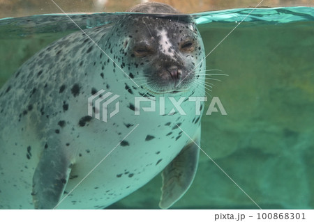 水中から見つめるゴマフアザラシ 城崎マリンワールド
