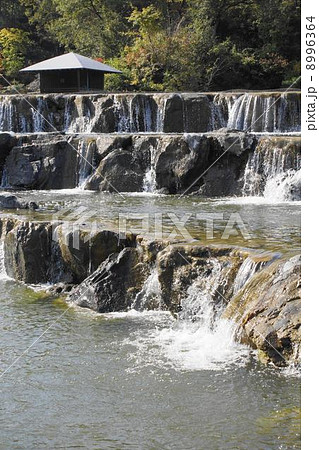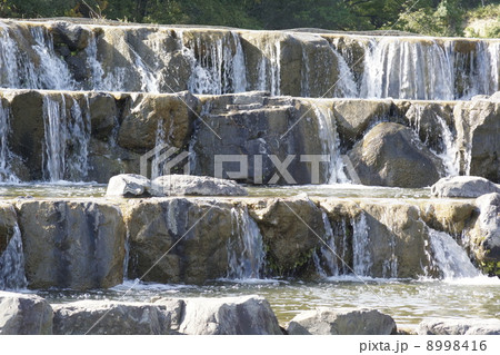 けいはんな記念公園「水景園」水景棚アップ 流れ落ちる水とたくさんの小さな滝