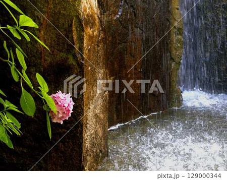 けいはんな記念公園の巨石群に落ちる滝と紫陽花