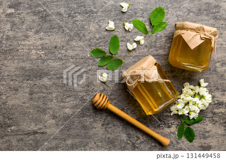 robinia honey bollte with acacia blossoms on colored table