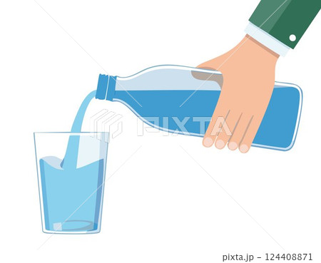 Hand holding and pouring water from bottle to glass on white background