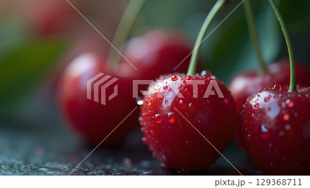 Macro shot of fresh ripe red cherries with water droplets creating a glistening effect