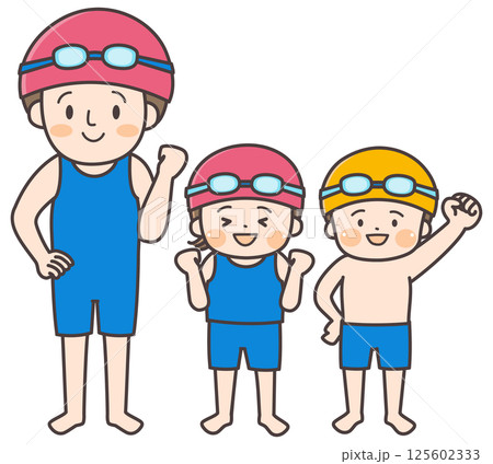 ガッツポーズをする水着姿の女性と子どもたちのイラスト