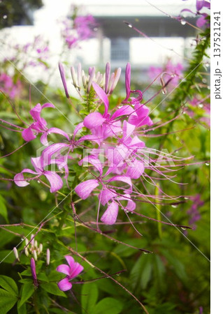 雨に濡れたピンクのクレオメの花(ネパール・アンナプルナ)
