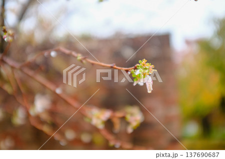 Close-up of cherry blossom with raindrops during winter. Winter flowers scene. Flower and plant.